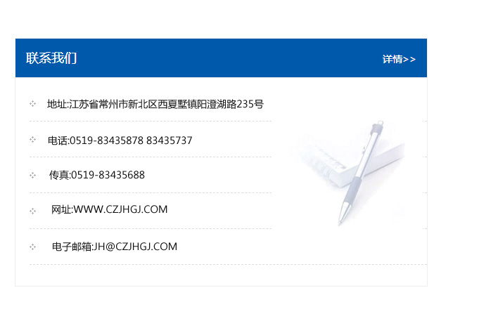 傳真:0519-83435688    郵編:213135    網址:WWW.czjhgj_com.shen1888.com    電子郵箱:JH@czjhgj_com.shen1888.com